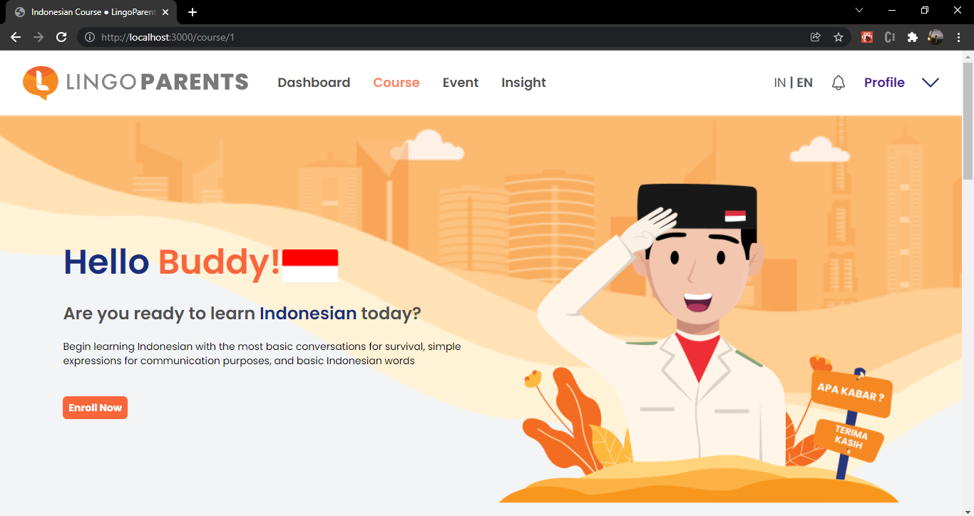 During internship program in Glints Academy x Kampus Merdeka. I contributed building some pages in LingoParent project such as Course Page, Enrollment Page, Navbar, Footer, etc.